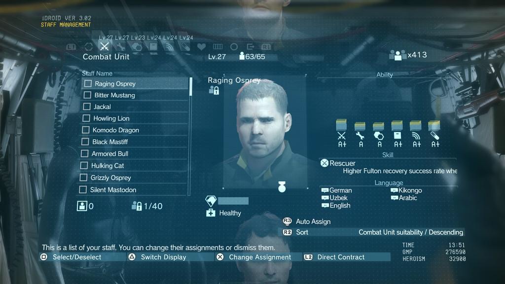 Staff Management menu Published September 20, 2015 at 1024 × 576 in Metal Gear Solid V: The Phantom Pain (Review) ← Previous Next → Staff management menu